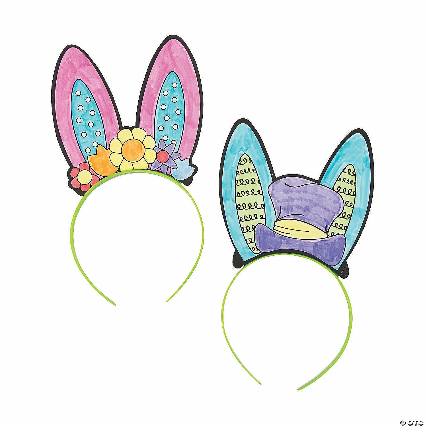 Spring into Easter with a hands-on coloring project for kids! This assortment of Color Your Own Bunny Ear Headbands includes two designs to suit all kinds of bunnies. One style features bunny ears with a top hat while the other features a flower crown. More kidsโ Easter crafts are just a hop, skip and a jump away on our site! Cardboard with a plastic band. Band, 5″; cutouts, 5 1/2″ – 6″ x 5 3/4″. ยฉ OTC