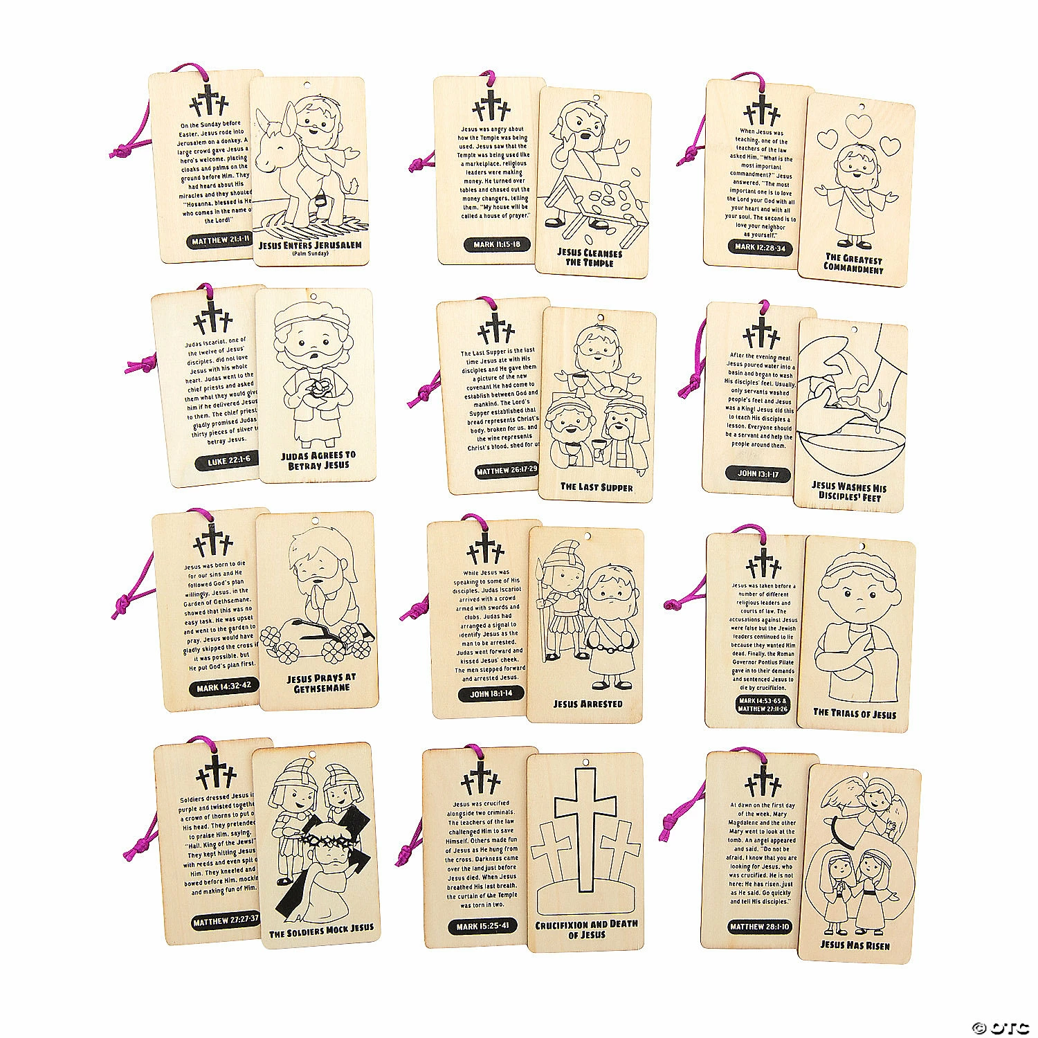 Help kids reflect on the events of Holy Week leading up to Jesusβ Resurrection with these fun color-your-own ornaments featuring moments from the first Holy Week and Easter. Kids can use markers or paint (sold separately on this website) to color these ornaments that they can then take home or use as Sunday School classroom decorations. Display these ornaments all together for an artistic retelling of Holy Week and Easter. Wood. 2 1/2″ x 4″ Β© OTC