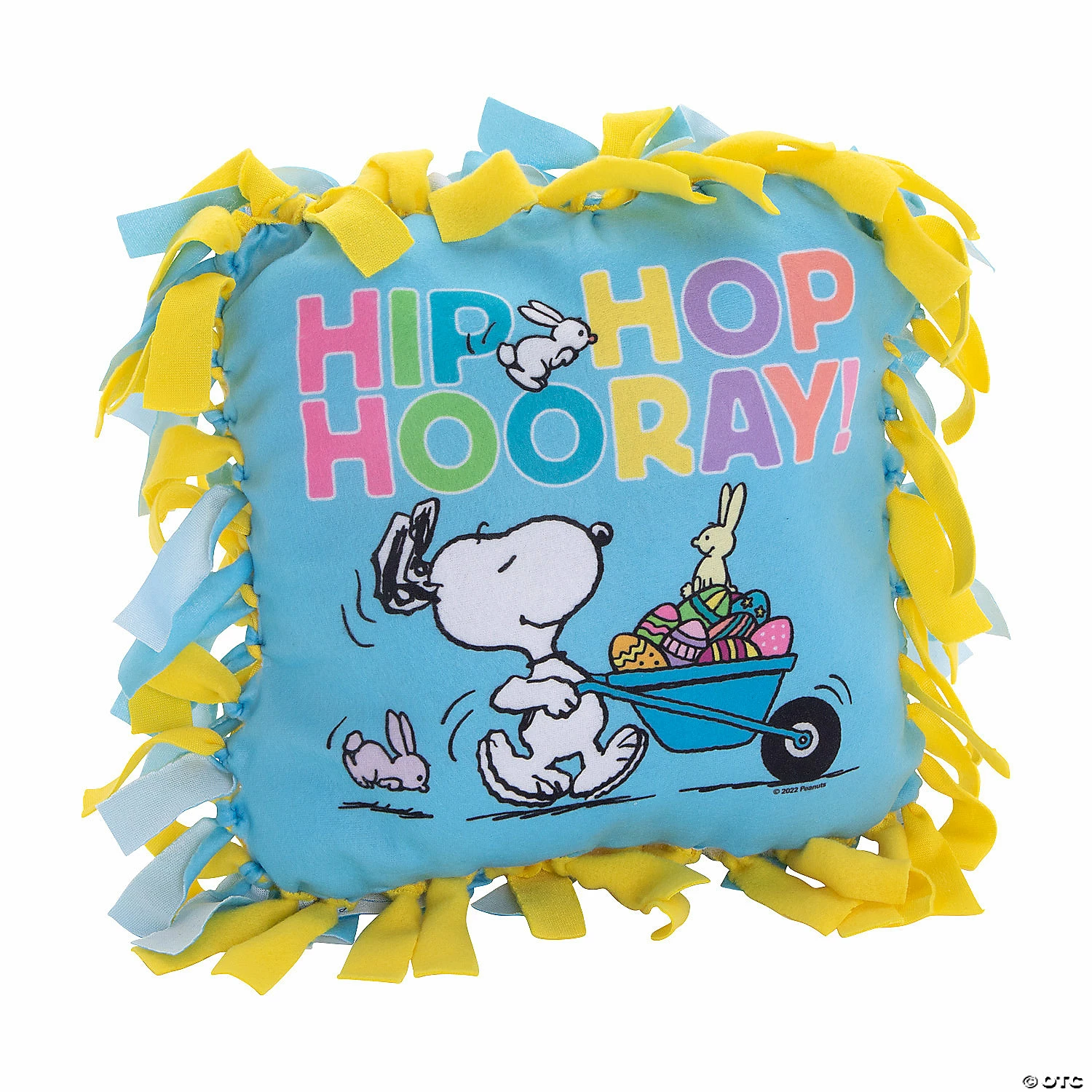 Hip hop hooray! Celebrate Easter with this fun craft kit featuring beloved characters from the Peanuts® gang. The completed craft features a colorful image of Snoopy and Woodstock and a wheelbarrow full of decorated Easter eggs. This simple craft activity creates up to six fleece pillows that can be enjoyed as Easter gifts or as additions to Easter home decor. Includes pre-cut fleece fringe and polyester fiberfill stuffing. Unfinished, 16 1/2″. Makes 6. All craft kit pieces are pre-packaged for individual use. Kits include instructions. Imported. Only at OTC / © 2021 Peanuts Worldwide LLC